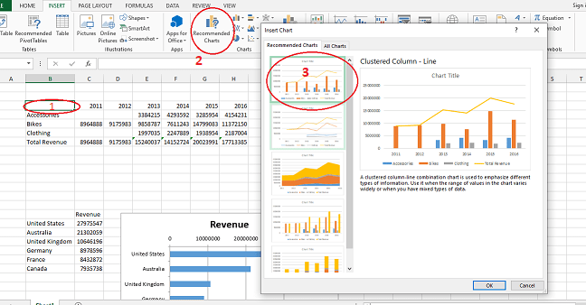 Untuk membuat chart, (1)pertama-tama klik pojok kanan atas dari data pertama (pada gambar disamping ada di pada cell B3), (2)lalu masuk ke menu insert kemudian klik recomended chart, (3) pilih chart yang paling atas.